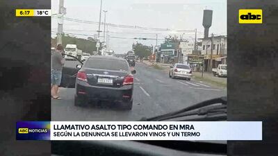 Este artículo tiene 2 años de antigüedad Unos tres hombres armados, uno de ellos con ropa de camuflaje, interceptaron un vehículo Toyota Allion color negro en plena ruta Transchaco casi Nanawa en Mariano Roque Alonso hacia el puente Remanso y según denuncia de las víctimas, que fue muy tarde, robaron vinos en una caja y un termo.