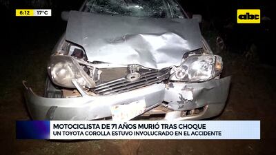 Este artículo tiene 2 años de antigüedad Un motociclista identificado como Juan Antonio Cazal Ayala, de 71 años, falleció tras chocar con su biciclo contra un automóvil Toyota Corolla en la intersección de las calles Victorio Curiel casi Nuestra Señora de la Asunción, barrio Capilla del Monte, de San Lorenzo. Según manifestaciones del conductor del vehículo a la policía, él iba a velocidad prudencial sobre la avenida Curiel y repentinamente salió al paso el motociclista y allí se produjo el impacto.