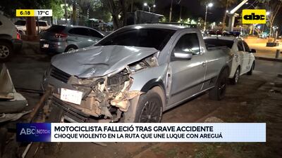 Este artículo tiene 2 años de antigüedad Un motociclista identificado como Roberto Alejandro Cáceres Rolón de 24 años falleció luego de chocar frontalmente contra una camioneta Volkswagen tipo Saveiro sobre la avenida Las Residentas, en el barrio 3 de Mayo en la ruta que une Luque con Areguá. Según el conductor del automóvil Juan Jesús Segovia Guillén de 28 años, el motociclista circulaba sin luz sobre la avenida Las Residentas con dirección a Areguá y el salió de una calle en inmediaciones del balneario Rey Lagarto para irse hacia Luque y allí se produjo el violento choque, que produjo múltiples heridas al motociclista.