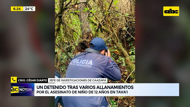 Este artículo tiene 2 años de antigüedad Un detenido tras allanamientos por el asesinato de niño de 12 años en Tava’i. “Esto inicia hace un mes cuando el padrastro estaba en su domicilio y escuchó 2 disparos al fondo de su casa y fue a verificar. Al llegar se encontró con Marcos Cuevas y 3 personas más. Estaban cometiendo abigeato”, crio. César Diarte