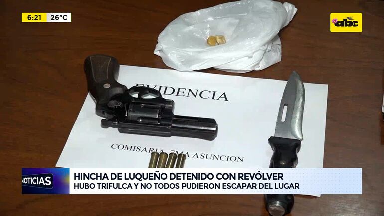 Este artículo tiene 2 años de antigüedad Un supuesto integrante de la barra Chancholligas del Sportivo Luqueño identificado como Jorge Marcelo Ozuna de 28 años y con antecedentes fue detenido tras los incidentes en cancha de Guaraní. Aparentemente, a Ozuna, una adolescente de 14 años le acercó un revólver calibre 38 que estaba en uno de los buses, pero fue incautado junto a un cuchillo y dosis de cocaína tipo crack.