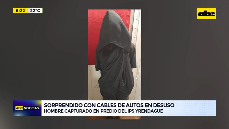 Este artículo tiene 2 años de antigüedad Por tener en su poder cables de vehículos en desuso y accesorios de camionetas, un hombre identificado como Diego Ariel Montalbeltti de 28 años fue detenido dentro del predio de la clínica periférica del IPS Yrendague de Mariano Roque Alonso. Funcionarios de la institución observaron al hombre con una bolsa cargada en mano, avisaron a la policía y lo encontraron en flagrancia. No opuso ninguna resistencia en el momento de la captura.