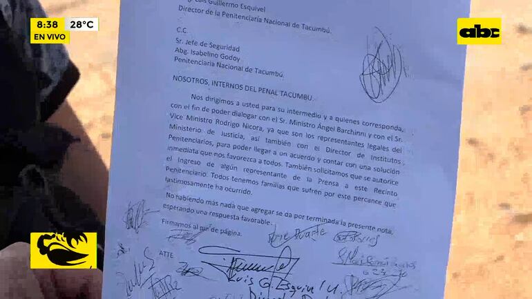 Este artículo tiene 2 años de antigüedad En una particularmente bien redactada nota, los internos del penal de Tacumbú esta mañana presentaron sus nuevas exigencias. El documento va dirigido a Isabelino Godoy, jefe de seguridad de la Penitenciaría Nacional y, llamativamente, está incluso firmado por el director de la cárcel, Luis Esquivel, quien forma parte de los funcionarios retenidos desde ayer.