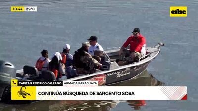 Este artículo tiene 2 años de antigüedad Continúa la búsqueda del sargento Sosa. “Nuestra área de cobertura y de rastrillaje se ha ampliado, ya que han pasado 96 horas. Manejamos varias hipótesis”, expresó el capitán Rodrigo Galeano, jefe de equipo de búsqueda y rescate de la Armada Paraguaya.