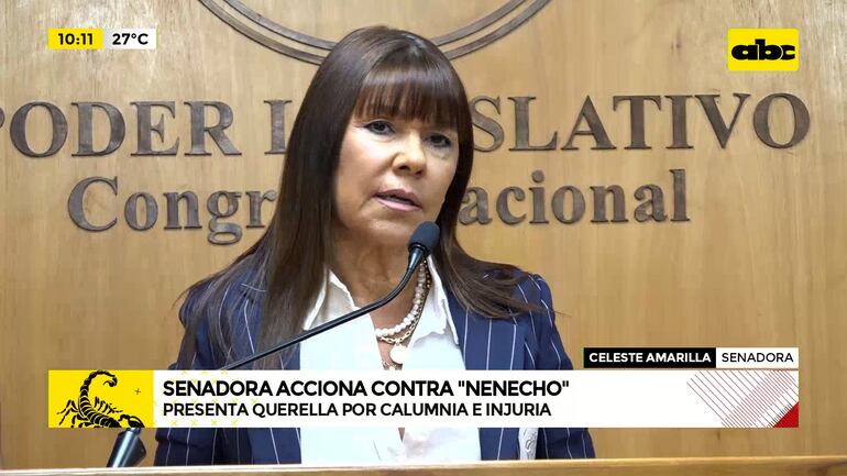 Este artículo tiene 2 años de antigüedad La senadora Celeste Amarilla presenta querella contra Óscar “Nenecho” Rodríguez, intendente de Asunción. Exige la suma de G. 1000 millones por daños. “Él mintió. No puedo enfrentar una mentira. Tomamos la decisión de querellarle. Ahora va a tener que pedir disculpas o llegamos hasta el final”, afirmó a legisladora liberal.