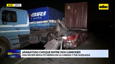 Este artículo tiene 2 años de antigüedad Un aparatoso choque entre dos camiones de gran porte dejó como saldo una mujer herida. Los dos camiones que transportaban soja y algodón iban en el mismo sentido y cuando el camión sojero al mando de Juan Eduardo Benítez de 33 años iba a girar en el estacionamiento de la empresa ADM en el camino que une Villeta con Alberdi fue chocado por la parte trasera con el camión con un container guiado por Robert Marcelo Zalazar de 55 años.