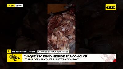 Este artículo tiene 2 años de antigüedad “Chaqueñito” envió menudencia nauseabunda a pobladores afectados por sequía. “Tal vez la intención es buena pero tampoco somos perros para recibir cualquier porquería que nos manden. Es un menosprecio. Es una ofensa contra nuestra dignidad. Es una pena. El senador Javier Vera, Chaqueñito, nos envió esto”, sacerdote Cristóbal Acosta, párroco de Tte. Irala Fernández.