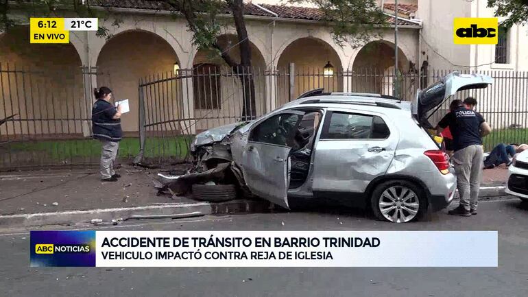 Este artículo tiene 2 años de antigüedad Un accidente de tránsito se produjo esta mañana en el Barrio Trinidad, donde resultaron involucrados jóvenes aparentemente en estado etílico, el vehículo en el que se trasladaban impactó contra la reja de una iglesia. No se reportan heridos.