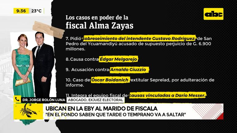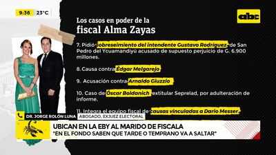 Este artículo tiene 2 años de antigüedad Ubican en la EBY a Adolfo Álvarez Ketterer, marido de fiscala que lleva casos vinculados a Cartes “Es grave que ocurra pero es más grave aún que funcionarias con estas causas se animen a hacerlo. En el fondo, saben que tarde o temprano, esto va a saltar y se va a saber”, abogado Jorge Rolón Luna.