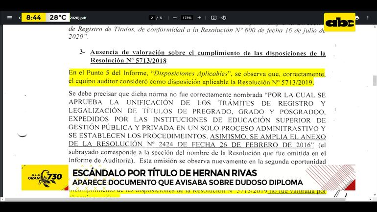Este artículo tiene 2 años de antigüedad Aparece un documento que reiteraba al MEC sobre la ilegalidad del título de Hernán Rivas. En el 2020 ya se realizó una investigación interna que demostró la ilegalidad del título, pero este informe fue cajoneado por el entonces ministro de Educación, Eduardo Petta.