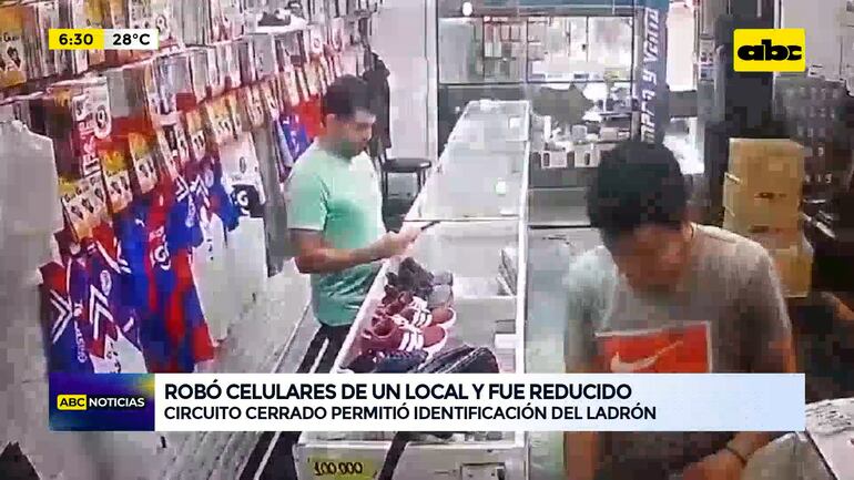 Este artículo tiene 2 años de antigüedad Un hombre identificado como Sever Rodrigo Brizuela, de 39 años, quien tiene antecedentes por reducción, fue detenido porque está sindicado como autor del robo de cuatro celulares del local “Mati Cell” en la zona del Mercado 4 de Asunción. El propietario se percató del robo tras el arqueo del negocio y acercó el circuito cerrado a la policía.