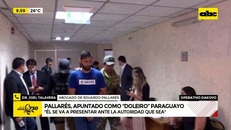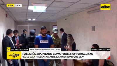 Este artículo tiene 2 años de antigüedad El abogado Joel Talavera se presentó como defensor de Eduardo Pallarés, quien, según la Senad, sería el “doleiro” del esquema desbaratado con la operación Dakovo. “Para la justicia paraguaya, él no tiene absolutamente ningún proceso ni ningún reclamo de las autoridades brasileras para aquí, para Paraguay. Él se va a presentar ante la autoridad que sea. Él está a disposición de las autoridades”.
