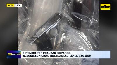 Este artículo tiene 2 años de antigüedad Un hombre fue detenido por realizar disparos al aire con arma de fuego a la salida de la discoteca Fugitiva, ubicada en barrio Obrero. Se trata de José Omar Patiño, de 30 años, que ante la presencia policial se subió a un automóvil de donde los agentes lo sacaron a la fuerza y la conductora echó llave a la puerta. Con una orden fiscal pudieron abrir el vehículo Toyota Runx y encontraron la pistola calibre 25 mm en la parte posterior del asiento del acompañante. El incidente tuvo lugar en la avenida Acuña de Figueroa y México.