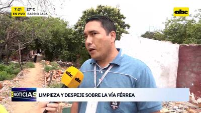 Este artículo tiene 2 años de antigüedad Realizan despeje y limpieza sobre la vía férrea en Barrio Jara, Asunción. “Es a pedido de la Fiscalía. Esta propiedad pertenece a FEPASA. Estamos dando una mano como municipio para la limpieza”, Ariel Andino, director de Vigilancia de la Municipalidad de Asunción.