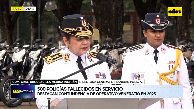 Este artículo tiene 2 años de antigüedad La comisario general Directora Graciela Medina Insfrán, Directora General de Sanidad Policial, durante su discurso en el acto de entrega de Bastón de Mando a Comisarios Generales, destacó que en 180 años de vida Institucional son mas de 500 policías fallecidos en actos de Servicios.