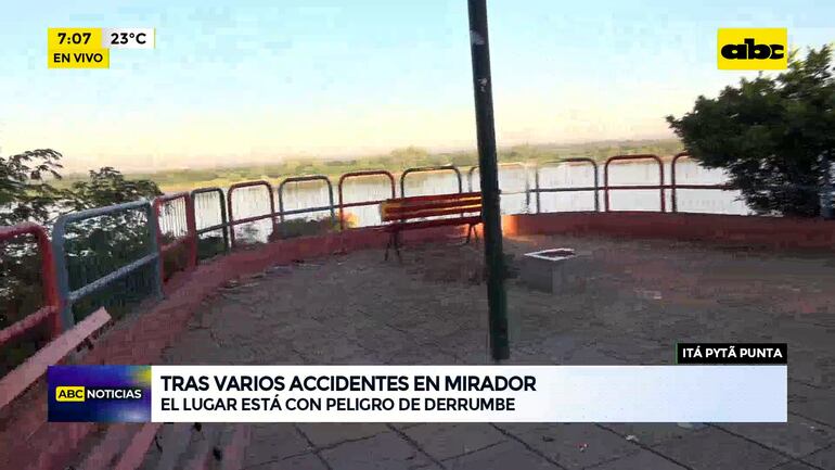 Este artículo tiene 1 año de antigüedad Tras varios accidentes en el Mirador de Itapytãpunta, pobladores lamentan que no sea reparado y que se encuentran en una situación de peligro. Desde ese entonces ruegan a las autoridades para recuperar el ruinoso sitio; sin embargo, no se toman acciones.
