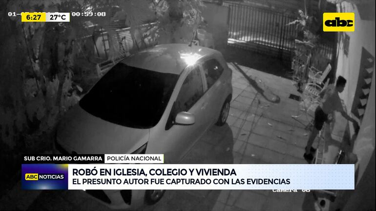 Este artículo tiene 1 año de antigüedad Un hombre sindicado de varios robos en capilla, iglesia, escuela y vivienda en la zona de Lambaré fue detenido e identificado como Matías Alexander Trinidad Cabañas de 24 años con varios antecedentes. De la casa donde reside la policía incautó todas las evidencias y que fueron denunciadas como robadas. En algunos sitios, se observa el accionar de Trinidad Cabañas en circuitos cerrados que fueron brindados por las víctimas.