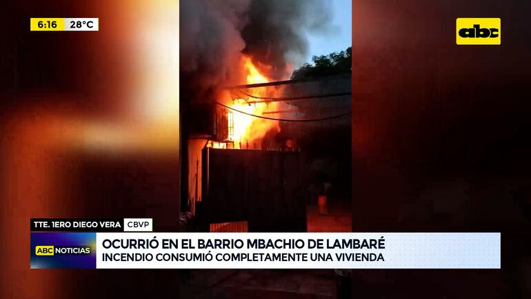 Este artículo tiene 2 años de antigüedad Una vivienda ubicada en el barrio Mbachio de Lambaré fue completamente consumida por las llamas, luego que se iniciara un siniestro por causas aún desconocidas y que tanto los vecinos como los Bomberos Voluntarios no pudieran controlar. Ninguna persona resultó herida durante el hecho.
