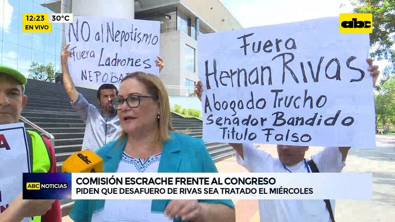 Este artículo tiene 1 año de antigüedad Integrantes de la Comisión Escrache se manifiestan frente al Congreso para expresar su molestia ante los escandalosos casos de nepotismo en el Legislativo y piden que el desafuero de Hernán Rivas sea tratado el miércoles.