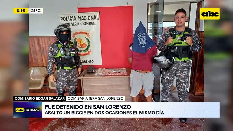 Este artículo tiene 1 año de antigüedad Un hombre con antecedentes fue detenido tras asaltar un local de Biggie en dos ocasiones durante el mismo día. En la primera ocasión robó Gs. 500 mil y en la segunda Gs. 800 mil.