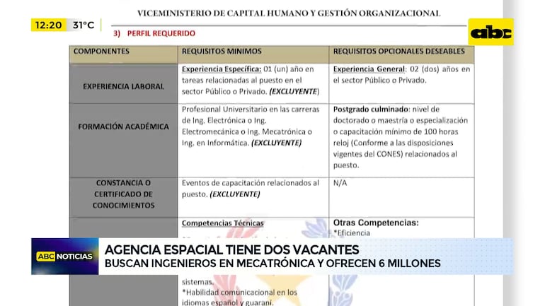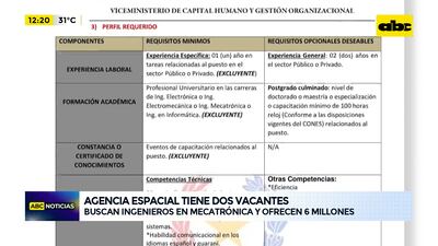 Este artículo tiene 2 años de antigüedad El portal público Paraguay Concursa publicó varias vacancias disponibles en diferentes instituciones. Se destaca la convocatoria que hacen desde la Agencia Espacial para contratar a dos ingenieros con un salario de sólo 6 millones de guaraníes para todo lo que exigen. Esto en medio del escándalo de las denuncias de nepotismo en la función pública.