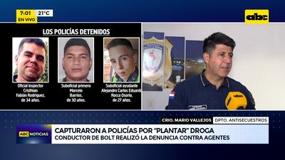Este artículo tiene 1 año de antigüedad Capturan a 3 policías por supuestamente plantar droga. Un conductor de Bolt fue el que realizó la denuncia contra los agentes. Los detenidos fueron identificados como el oficial Cristhian Fabián Rodríguez, el suboficial primero Marcelo Barrios y el suboficial ayudante Alejandro Carlos Eduardo Rocca Osorio.