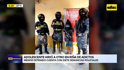 Este artículo tiene 1 año de antigüedad Un adolescente de 15 años fue detenido en la Comisaría Octava de Capiatá por supuestamente herir con cuchillo a un hombre de 22 años identificado como Erick Ezequiel Zucchini Peñayo, quien tuvo cortes en varias partes del cuerpo en una riña aparente entre adictos.