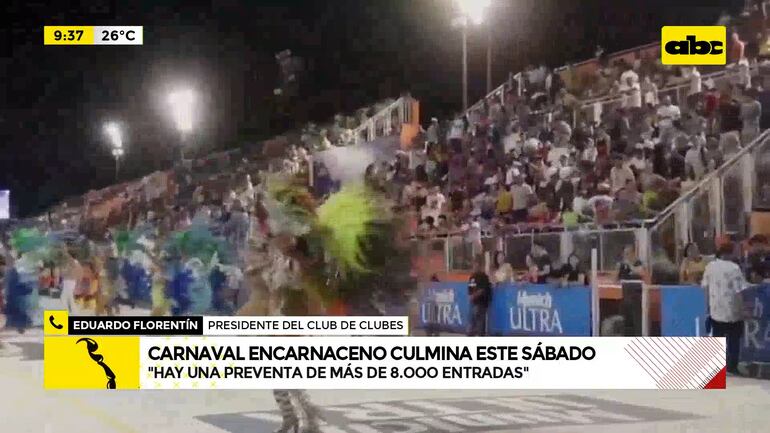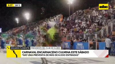 Este artículo tiene 1 año de antigüedad En comunicación con ABC Cardinal este viernes, Eduardo Florentín, presidente del Club de Clubes del Carnaval de Encarnación, el mayor de los eventos de ese tipo en Paraguay, comentó que se espera una concurrencia de alrededor de 14.000 personas para la noche final de la edición de este año de esa fiesta, que tendrá lugar mañana en el “sambódromo” del Centro Cívico Municipal “Betty y Mario Pérez”.