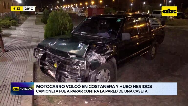 Este artículo tiene 1 año de antigüedad Dos personas resultaron heridas tras el vuelco de un motocarro en la zona de la Costanera Norte de Asunción, hacia el puente Héroes del Chaco. El accidente se produjo, aparentemente luego de que una camioneta chocara en la parte trasera del motocarro. Producto del golpe, la camioneta fue a parar contra la pared de una caseta deshabitada y ubicada en el paseo central de la Costanera.
