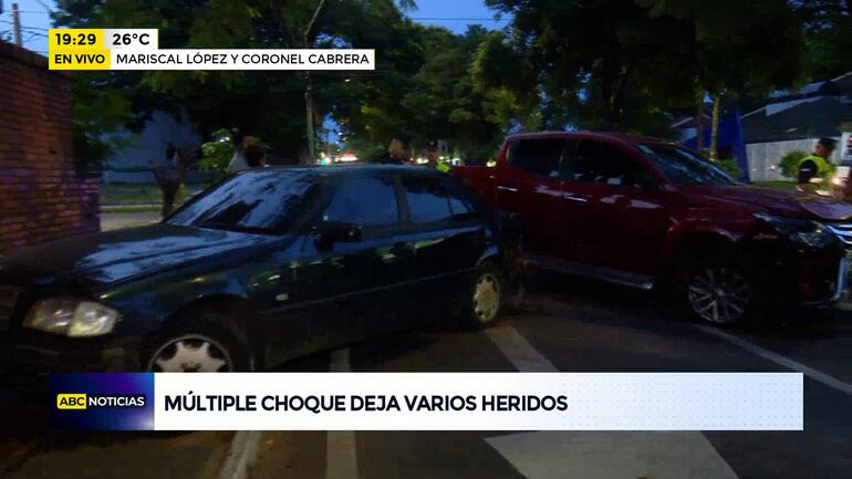 Este artículo tiene 1 año de antigüedad En la tarde de este jueves se registró un múltiple choque en la intersección de la avenida Mariscal López y Coronel Félix Cabrera, dejando varios heridos. Testigos cuestionan la tardanza de la Policía Nacional en llegar hasta el lugar del hecho.
