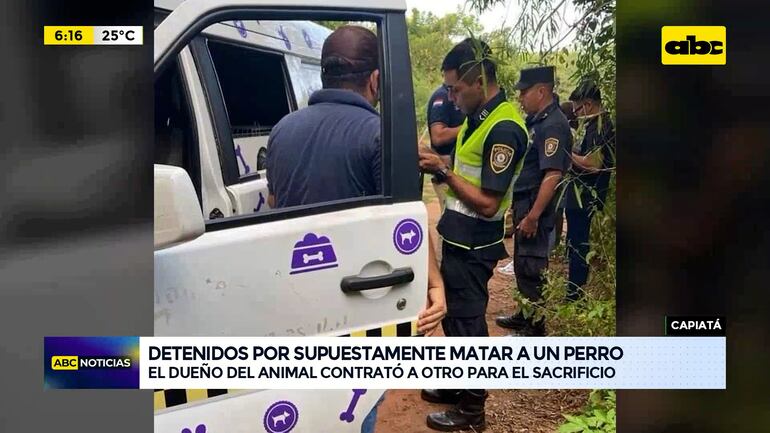 Este artículo tiene 1 año de antigüedad Dos hombres fueron detenidos por ser sospechosos de matar a un perro en el barrio San Antonio de Capiatá tras la denuncia de un vecino. Se tratan de Juan Cañiza Pereira de 56 años y Óscar Wilfrido Penayo de 41 años, quienes deberán declarar ante la fiscal Carolina Martínez. Aparentemente, Penayo sería el dueño del animal y contrató los servicios de Cañiza Pereira para el sacrificio del perro, cuyo desenlace fatal fue en un patio baldío.