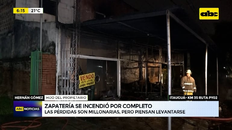 Este artículo tiene 1 año de antigüedad Un incendio consumió por completo la zapatería “Jorgito”, ubicada en el Km 35 de la ruta PY02 en la zona de Itauguá. Las pérdidas son millonarias que ascienden a unos 2500 a 3000 millones de guaraníes, pero no hubo víctimas que lamentar. El dueño inhaló humo, fue atendido pero nada de gravedad.