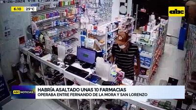 Este artículo tiene 1 año de antigüedad Un joven fue detenido tras asaltar una farmacia en Fernando de la Mora. Quedó registrado en circuito cerrado. Se presume que cometió al menos otros nueve hechos similares, también en farmacias ubicadas entre Fernando y San Lorenzo. Utilizaba el auto de su padre para perpetrar los hechos.