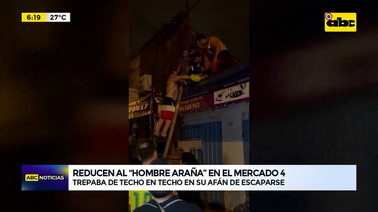Este artículo tiene 1 año de antigüedad Un hombre fue reducido por vecinos y locatarios del Mercado Municipal Número 4 cuando aparentemente intentó ingresar a un departamento. El sospechoso, tipo el “Hombre Araña” trepó por los techos de los salones comerciales; sin embargo, un grupo de personas lo golpearon, y lo atraparon en Rodríguez de Francia y Battilana, y finalmente, fue entregado a la Policía.