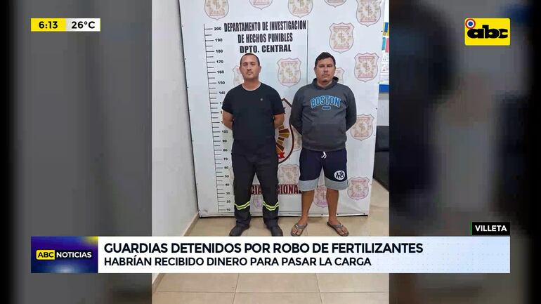 Este artículo tiene 1 año de antigüedad Dos guardias de seguridad fueron detenidos por estar supuestamente vinculados al robo de 100 bolsas de fertilizantes de la empresa Abonos del Paraguay que tiene su depósito en el predio de Calpar en Villeta ocurrido el 28 de abril pasado.