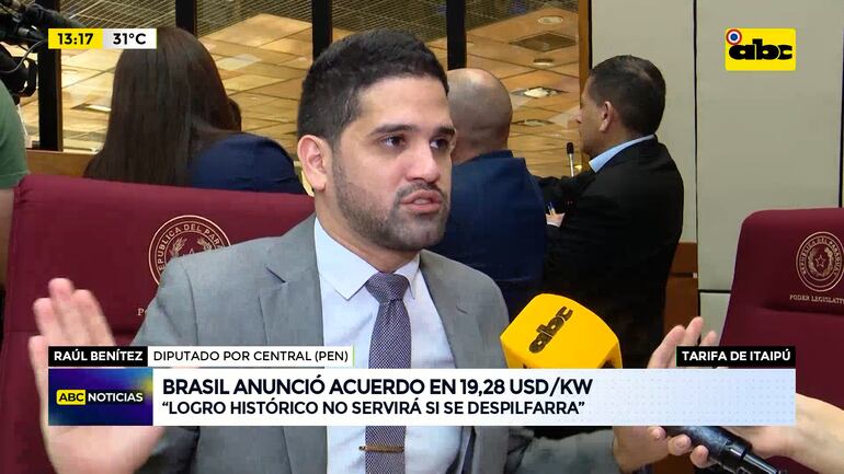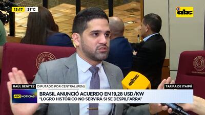 Este artículo tiene 1 año de antigüedad Luego de que el medio brasileño O Globo informara sobre un supuesto acuerdo para elevar la tarifa de Itaipú a 19,28 dólares por kilovatio/ mes, el diputado opositor Raúl Benitez prefirió no aventurarse demasiado ante la falta de un documento firmado que confirme dicho acuerdo. El legislador del Partido Encuentro Nacional señaló la falta de transparencia por parte del Gobierno de Santiago Peña y se mostró preocupado ante tanto silencio.