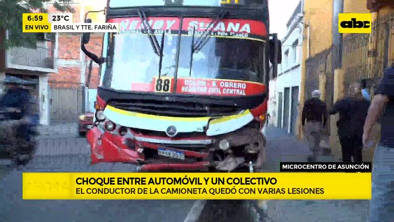 Este artículo tiene 1 año de antigüedad En la intersección entre las calles Brasil y Teniente Fariña de Asunción, un bus de la Línea 88, de la empresa La Lomita SA, impactó contra una camioneta tipo Kia Sorento. El percance se dio aparentemente porque no funcionaba el semáforo por falta de energía eléctrica, según confirmó la PMT.