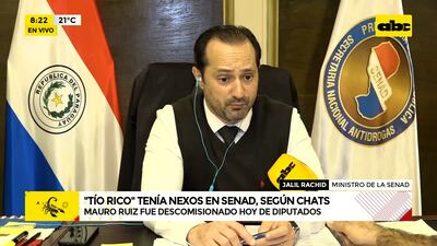 Este artículo tiene 1 año de antigüedad El titular de la Secretaría Nacional Antidrogas (Senad), Jalil Rachid, señaló que ya recibieron la notificación de que Mauro Antonio Ruiz Díaz Vallejos, vinculado con el caso A Ultranza, pasa a depender nuevamente de su institución luego de que Diputados revocara su comisionamiento. El nombre de dicho funcionario aparece en los chats filtrados de Miguel Ángel Insfrán, alias “Tío Rico”, que confirman que el presunto líder narco tenía acceso a información delicada.