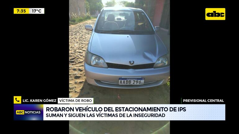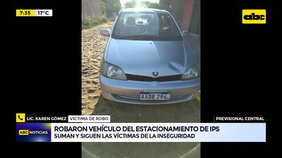 Este artículo tiene 1 año de antigüedad Nuevamente se da un caso de inseguridad en el estacionamiento del IPS Central, donde esta vez fue víctima una enfermera que presta servicio a la institución. Otros usuarios reportan que el sitio no cuenta con una custodia permanente y no existen cámaras en el lugar.