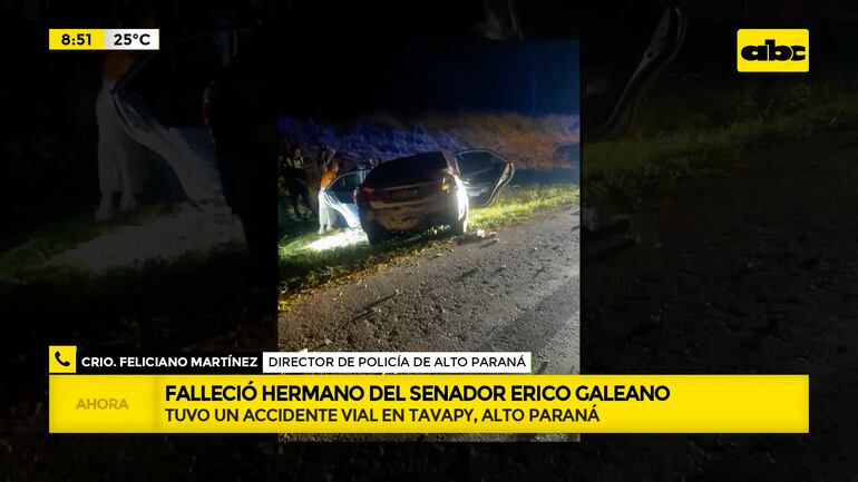 Este artículo tiene 1 año de antigüedad Trifino Daniel Galeano Segovia, hermano del senador Erico Galeano, murió tras colisionar el vehículo que conducía contra la base del portal de bienvenida al municipio de Tavapy, en Alto Paraná. El ahora fallecido había sido denunciado por un supuesto abuso sexual de una niña de 10 años.