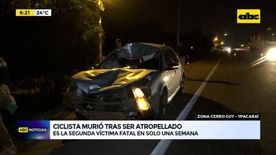 Este artículo tiene 1 año de antigüedad Un ciclista falleció tras ser atropellado por un automóvil sobre la ruta PY02 en la zona conocida como Cerro Guy de Ypacaraí en inmediaciones de Tuparenda. La víctima murió en forma instantánea por el violento impacto y nada pudieron hacer los bomberos voluntarios para reanimarlo. Es el segundo fallecido en la zona en menos de una semana.