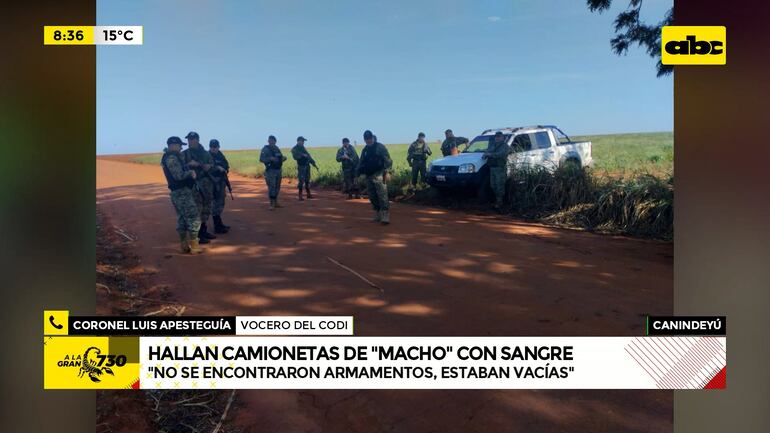 Este artículo tiene 1 año de antigüedad Cuatro camionetas presuntamente usadas por criminales al servicio de Felipe Santiago Acosta Riveros, alias Macho, para atacar a tiros un helicóptero militar, fueron encontradas a cinco kilómetros del lugar del tiroteo. Los vehículos presentan impactos de bala y dos tenían rastros de sangre, por lo que se sospecha que habría heridos o muertos entre los narcos.