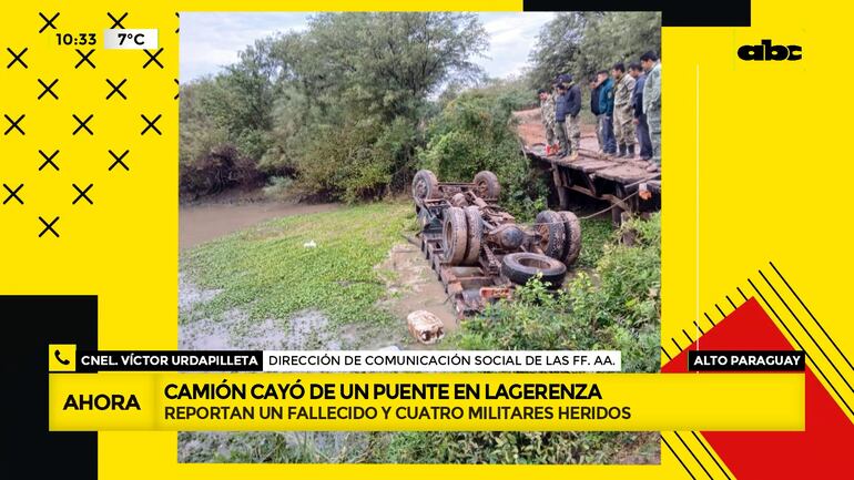 Este artículo tiene 1 año de antigüedad Un fallecido y cuatro militares heridos en accidente de tránsito en Lagerenza. Un camión perteneciente a la Fuerzas Armadas cayó de un puente que no estaba en condiciones para soportar la circulación