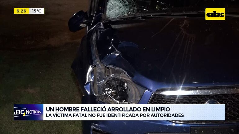 Este artículo tiene 1 año de antigüedad Un hombre falleció arrollado tras ser embestido y lanzado a una cuneta por una camioneta Ssangyong. El accidente con derivación fatal ocurrió sobre la Ruta Py 03, Limpio en las cercanías de la Comisaría 47 Central. La víctima no fue identificada por las autoridades por carecer de documentaciones, y por tanto, el cuerpo fue derivado a la morgue judicial como depósito.