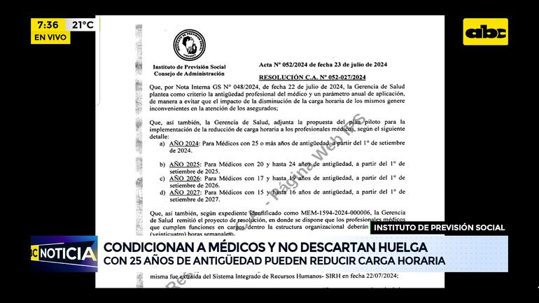 Este artículo tiene 1 año de antigüedad Desde el Consejo Administrativo del IPS, condicionan a médicos para concretar la reducción de la carga horaria. El requisito es contar con 25 años de antigüedad, lo que es rechazado por los profesionales de blanco y no descartan huelga.