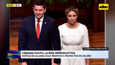 Este artículo tiene 1 año de antigüedad La diputada Fabiana Souto, esposa del vicepresidente Pedro Alliana, es la legisladora de la Cámara Baja con menos proyectos presentados hasta el momento. La improductiva representante del departamento de Ñeembucú asumió hace un año y su rendimiento fue bajo. Percibe al mes G. 32 millones de salario.