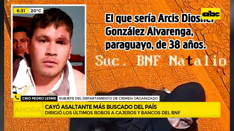 Este artículo tiene 1 año de antigüedad Detienen a Arcis González, uno de los asaltantes más buscados del país. Según informes, el detenido dirigió los últimos robos a cajeros y bancos del Banco Nacional Fomento. “Es una persona muy importante dentro de lo que es el esquema criminal, dentro de lo que es asalto a entidades bancarios, transportador de caudales, inclusive, investigado en los últimos hechos que sufrió el BNF en la zona de Natalio”, Crio. Pedro Lesme, subjefe del Departamento contra el Crimen Organizado de la Policía Nacional.
