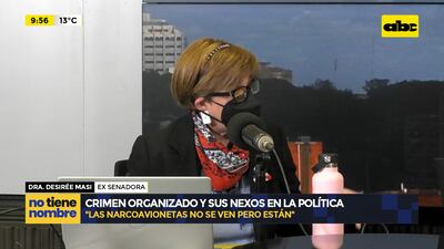 Este artículo tiene 1 año de antigüedad La exsenadora Desirée Masi afirmó que estamos viviendo de un narcoestado, cuya sociedad se ha encargado de blanquear a los delincuentes de cuello blanco. En ese sentido, lamentó que no exista voluntad política para enfrentar la problemática y que las denuncias realizadas sigan cajoneadas en la Fiscalía.