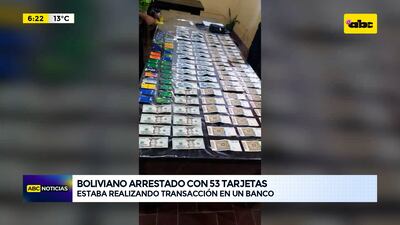 Este artículo tiene 1 año de antigüedad Un hombre de nacionalidad boliviana fue arrestado con 53 tarjetas de crédito y débito sin nombre, 200 dólares y cerca de tres millones de guaraníes en su poder. Esta persona estaba realizando transacción dudosa en un banco y un testigo avisó a la policía. De hecho, la gran cantidad de tarjetas en su poder llama la atención y solo pudo mencionar que pertenece a sus familiares. La investigación queda a cargo de crimen organizado e Interpol.