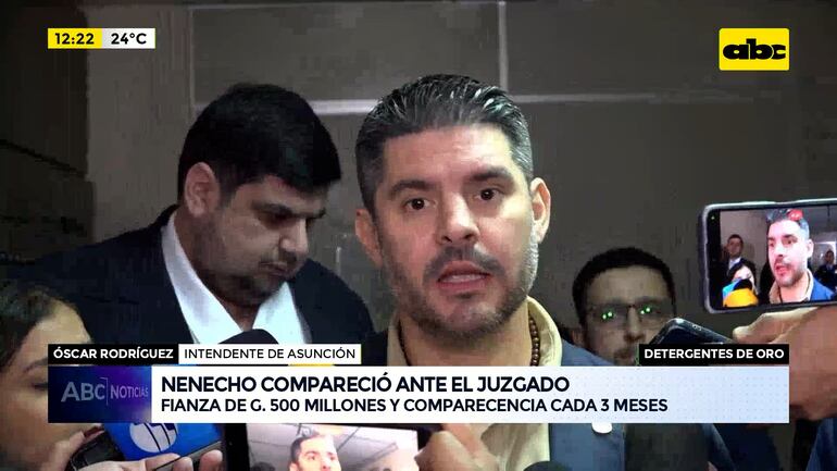 Este artículo tiene 1 año de antigüedad El intendente de Asunción, Oscar “Nenecho” Rodríguez, compareció ante el juez especializado en Delitos Económicos Rodrigo Lovera, en el caso conocido como “detergentes de oro”. Tras la audiencia, el juez determinó una fianza real de 500 millones de guaraníes, para lo cual el intendente ofreció como garantía el inmueble de un tercero, además de la comparecencia ante el Juzgado cada tres meses y la obligación de avisar al Juzgado en caso de salir del país.